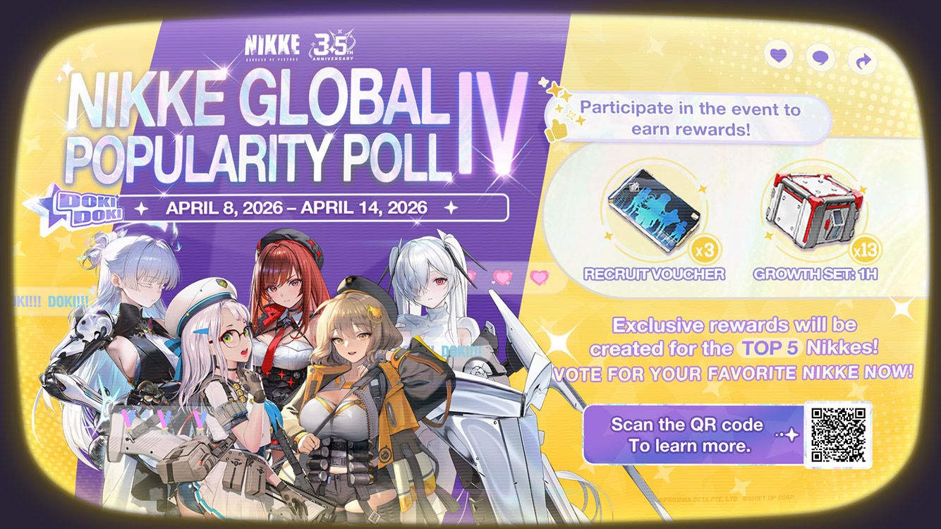 1. The poll only includes obtainable Nikkes as of April 8 (limited Nikkes and collaboration characters are excluded). The winners of previous popularity polls, Modernia, Red Hood, and Rapi: Red Hood, will enter the Popularity Hall and be excluded from the current poll.